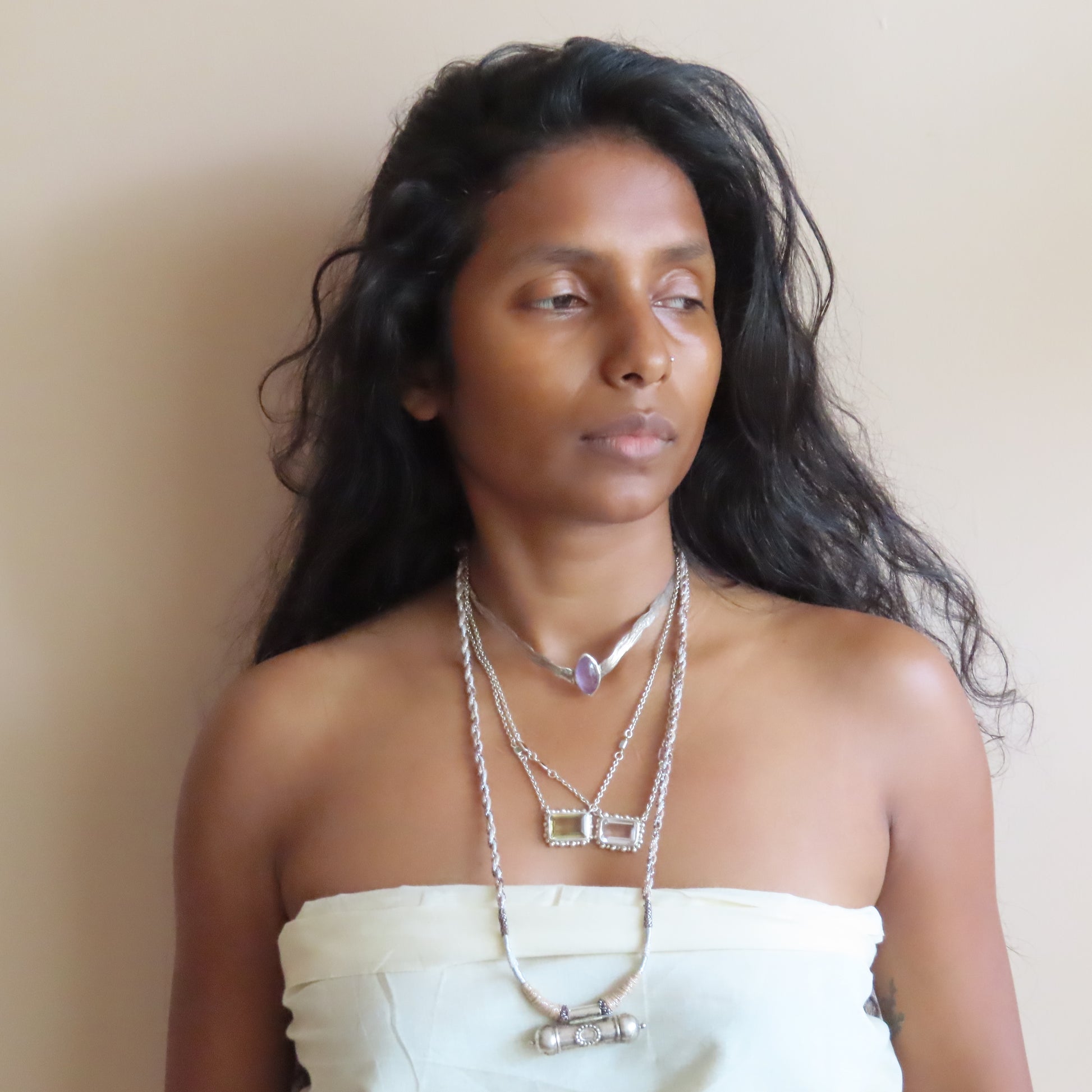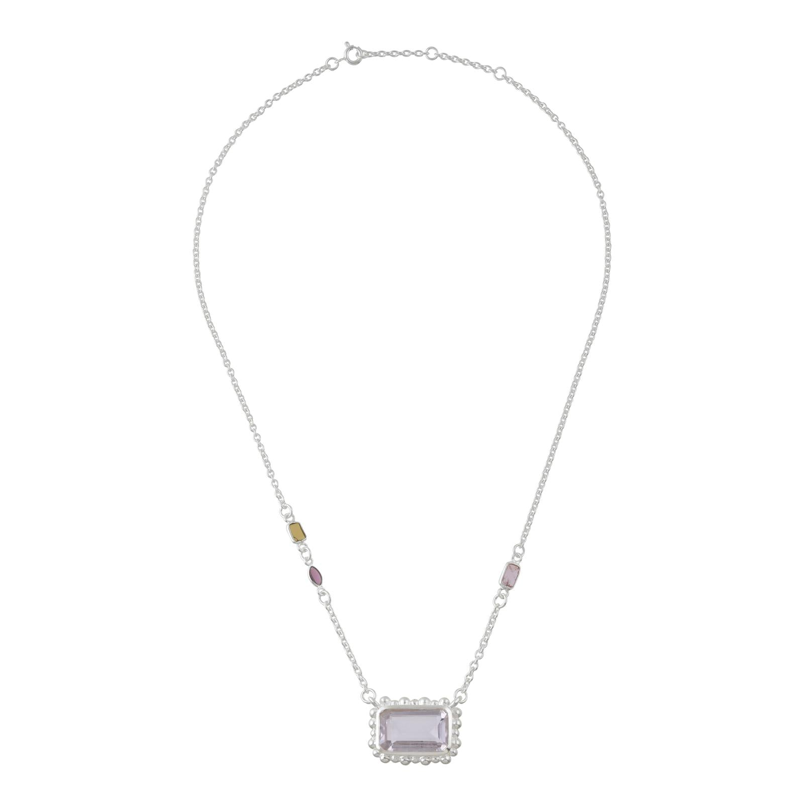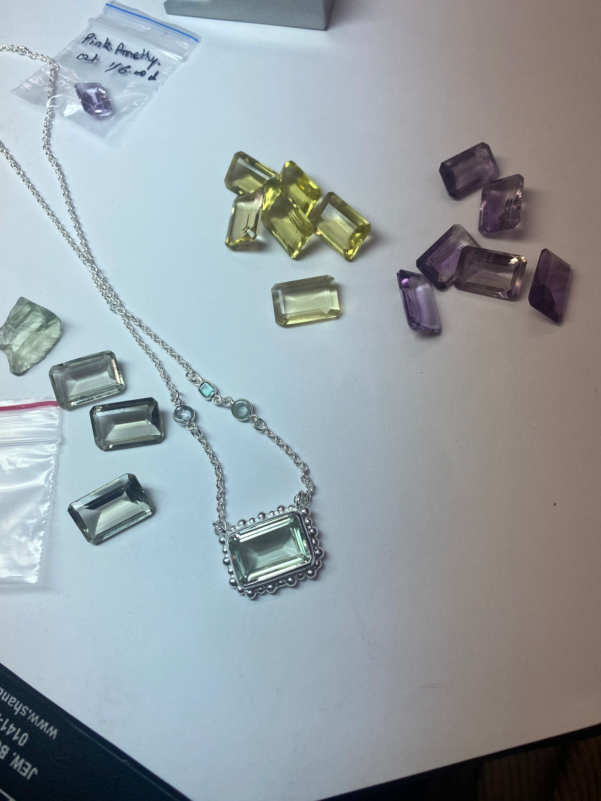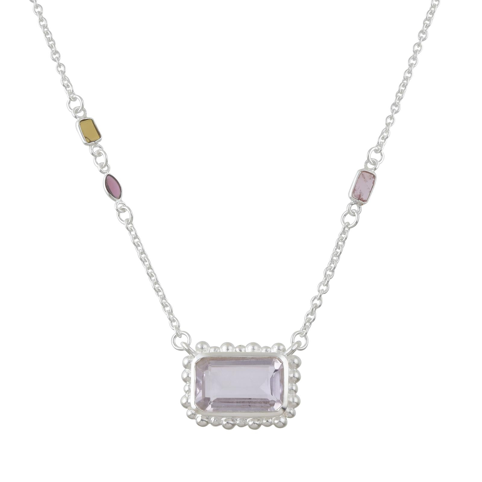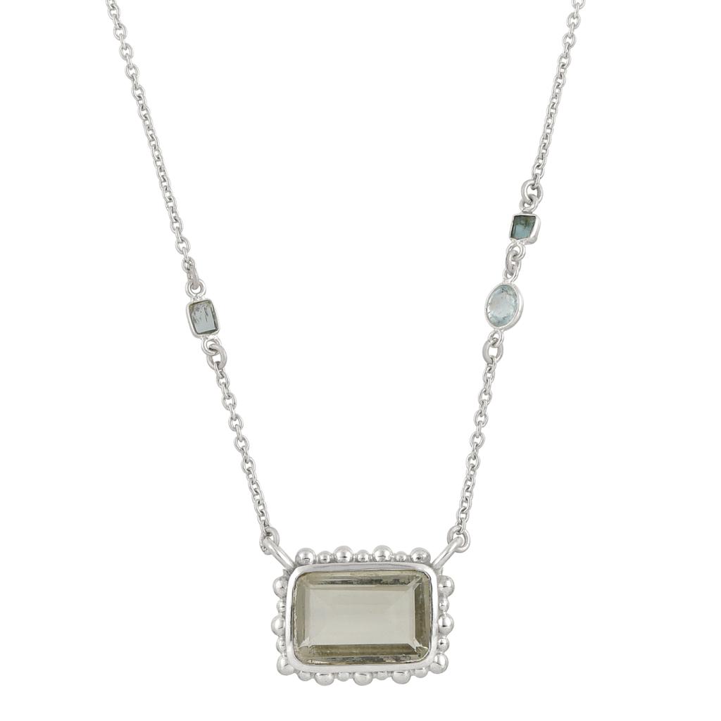 The silver chain includes two additional stones along its length — an aquamarine and a tourmaline.