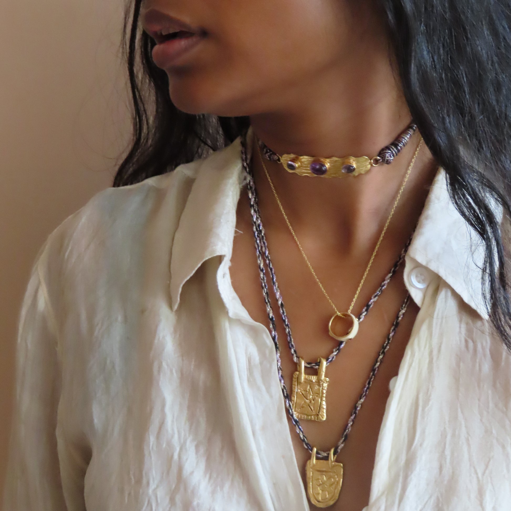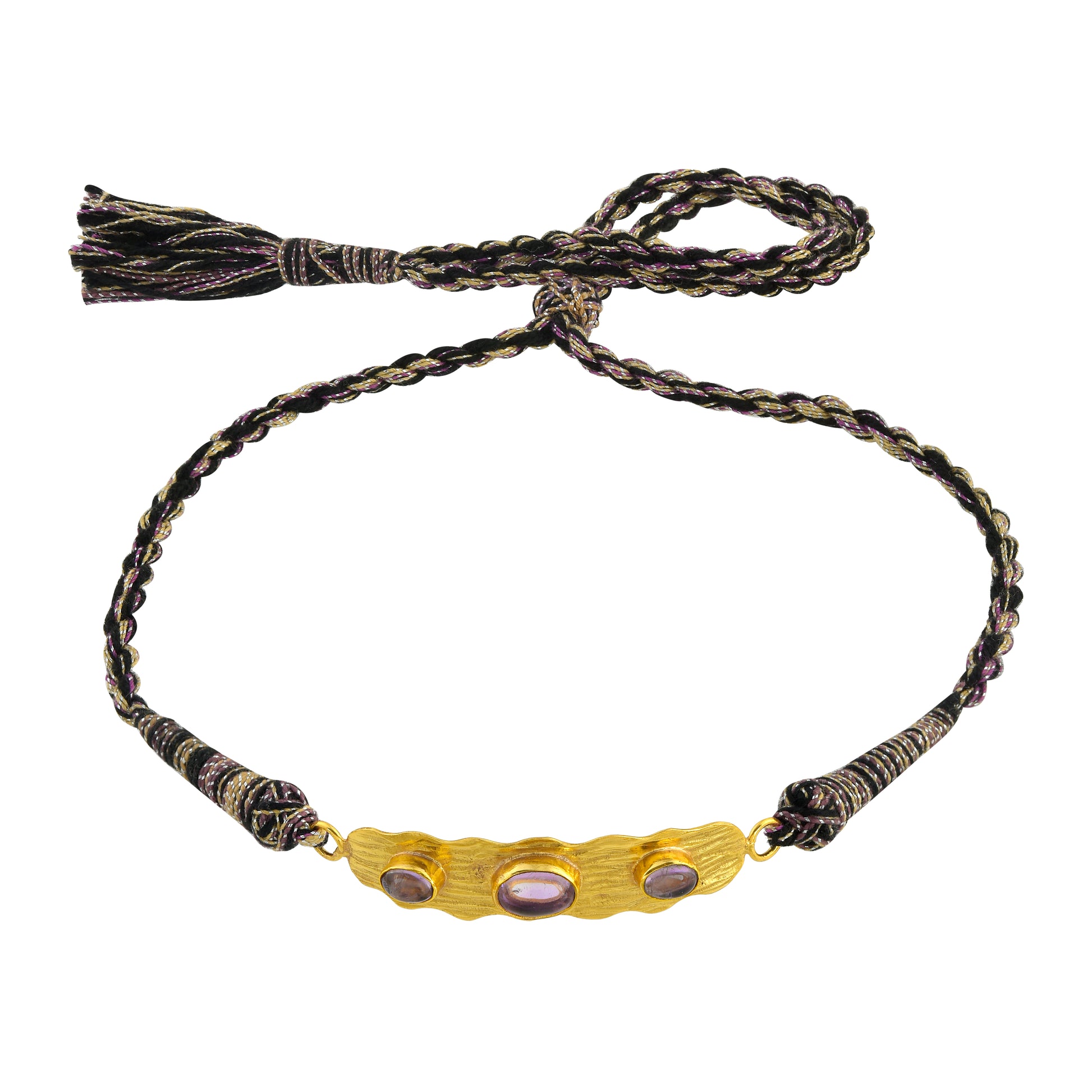 Three lavender amethyst and an adjustable hand woven cord, inspired by the traditional jewelry of Rajasthan.