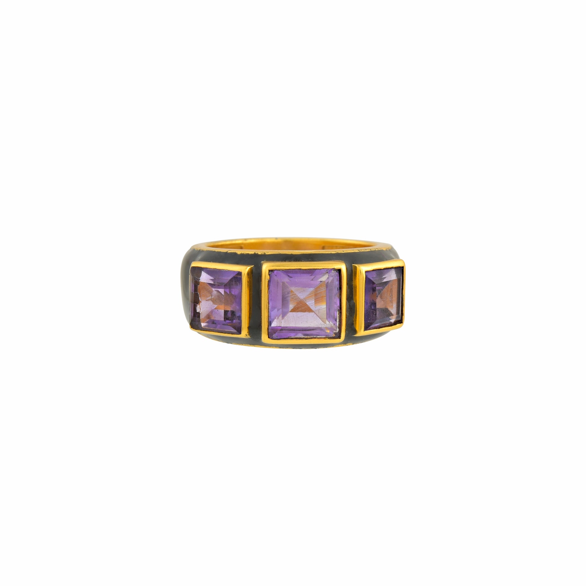 Three stones ring is made of brass with black enamel.